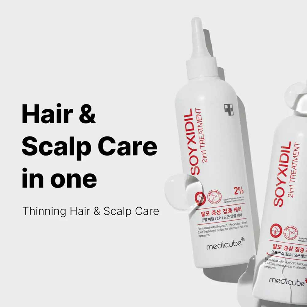 Buy MEDICUBE Soyxidil 2 in 1 Treatment 265ml in UAE and strengthen your hair from root to tip with advanced Korean hair care technology. This dual-action treatment is designed to nourish the scalp while repairing damaged hair strands, helping improve overall hair health and thickness.