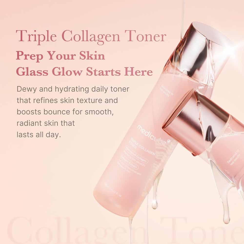 Medicube Triple Collagen Toner harnesses a sophisticated blend of three collagen types—hydrolyzed, atelo, and soluble—to deliver comprehensive skin firming and hydration. The formula works synergistically with hyaluronic acid to enhance moisture retention and plump the skin, while simultaneously addressing fine lines and improving elasticity.