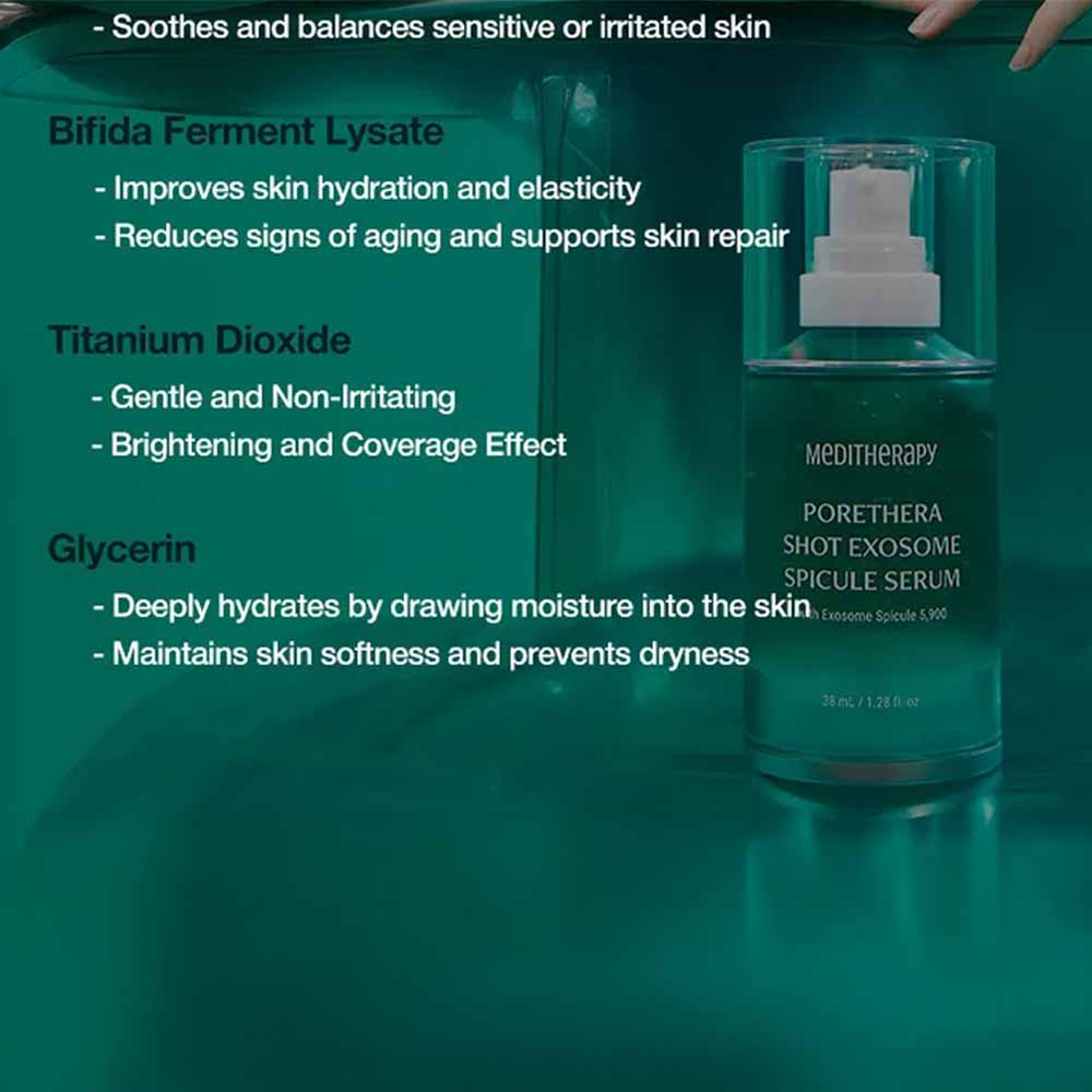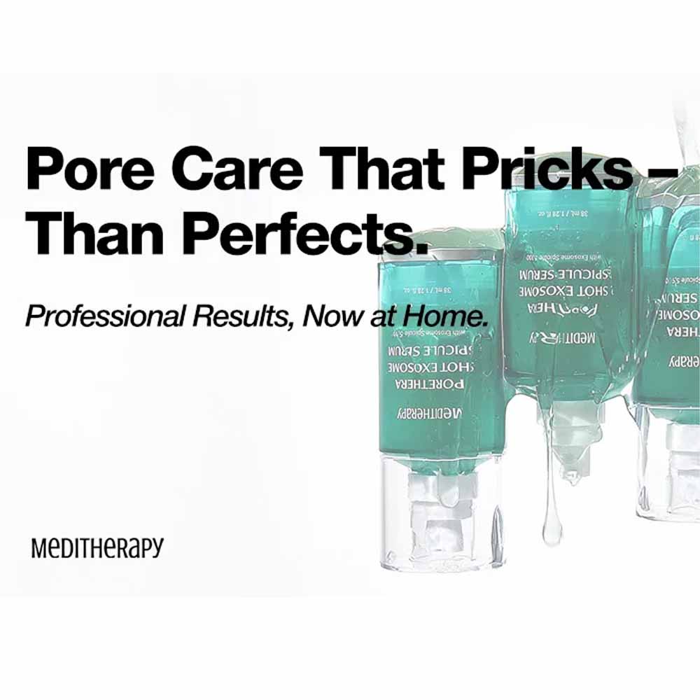 Revitalize your skin from within with the MEDITHERAPY Porethera Shot Exosome Spicule Serum 38ml, an advanced rejuvenating formula that targets pores, texture, and elasticity at a cellular level. Powered by Exosome Complex, Marine Spicules, and Bifida Ferment Lysate, this potent serum boosts skin regeneration, tightens pores, and enhances overall radiance.