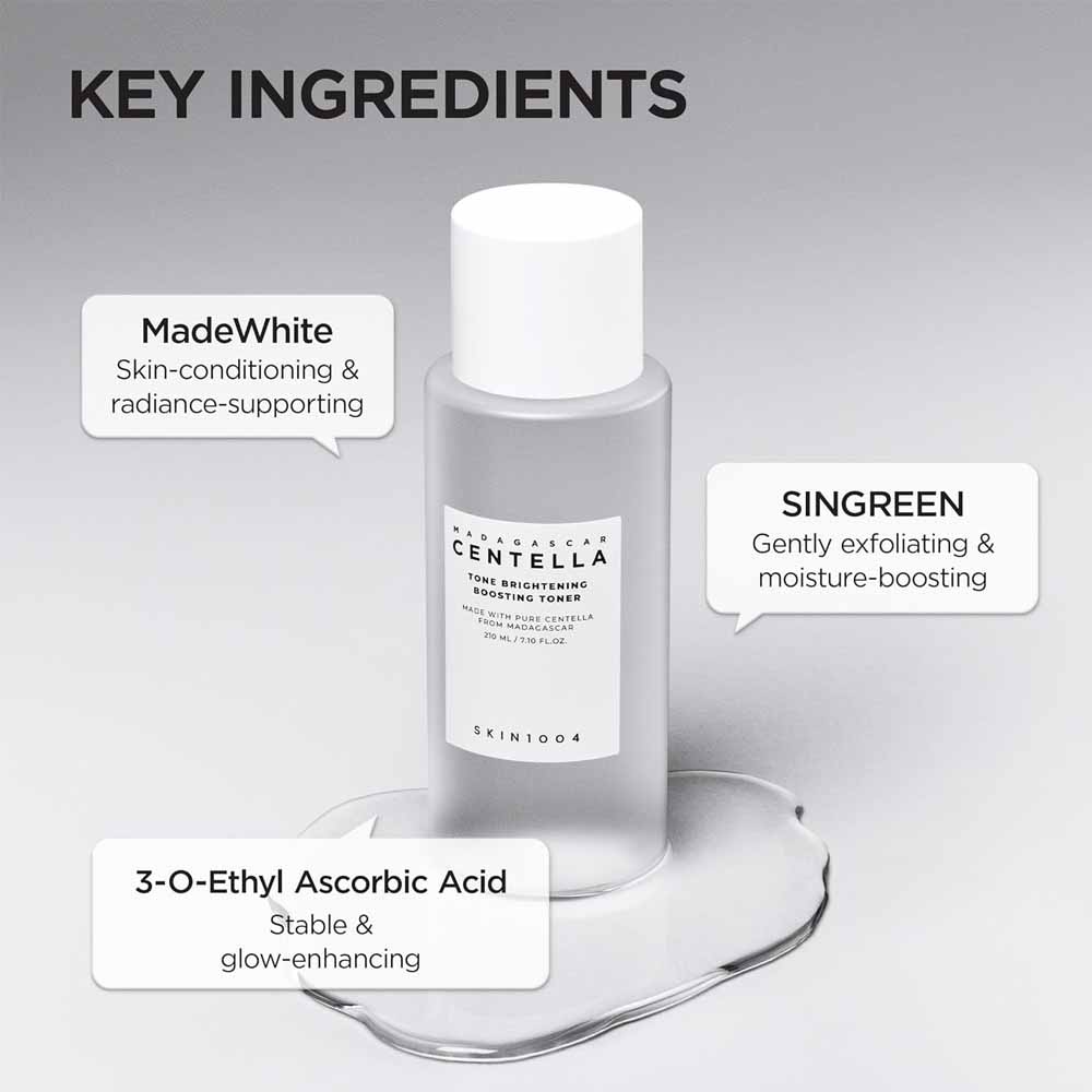 Brighten and balance your complexion with the SKIN1004 Madagascar Centella Tone Brightening Boosting Toner, a refreshing daily toner that helps to even skin tone, smooth texture, and enhance radiance. Enriched with Centella Asiatica Extract from Madagascar, it soothes irritation and strengthens the skin barrier, while Niacinamide and Tranexamic Acid target dark spots and dullness for a clearer, more luminous glow. Its watery, fast-absorbing texture leaves skin feeling hydrated, soft, and refreshed without any stickiness.
